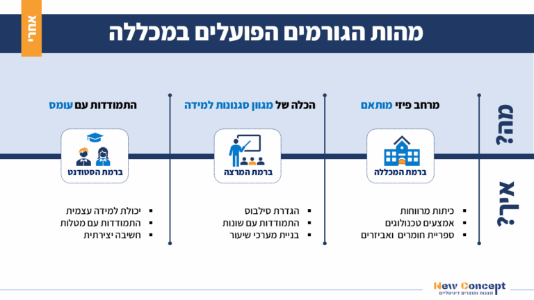 האלמנטים הוצגו בצורה של ציר כשבמרכזו אלמנטים אינפוגרפיים בצורת אייקונים. דרכם עובר קו חוצה, המבדיל בין "מה משפיע" על הסטודנט ובחלק התחתון מופיע "באיזה אופן"