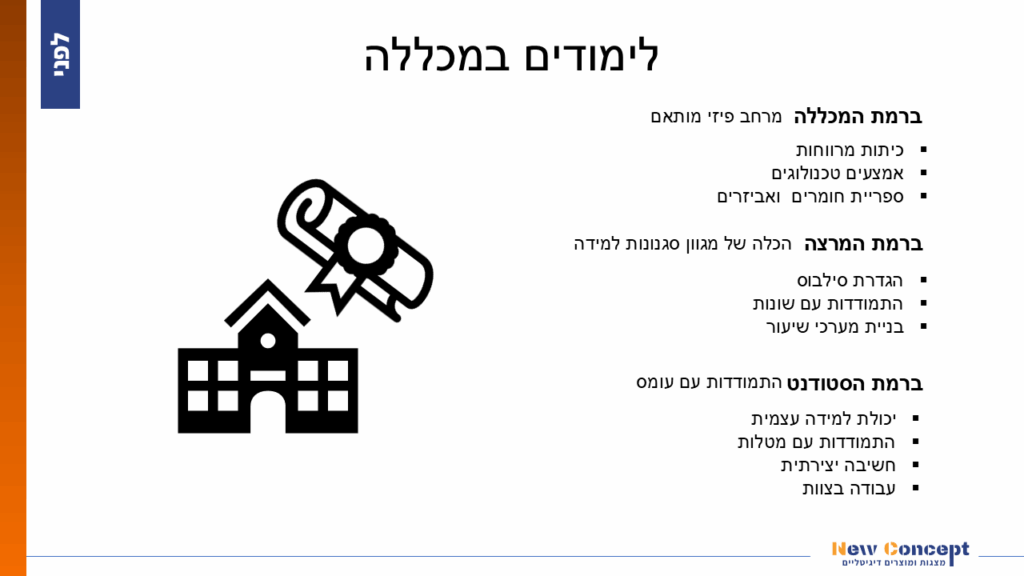 כשאנחנו מדברים על יצירת סדר ואירגון בשקופית – לפעמים כל מה שנדרש זה מיקום שונה של האלמנטים .למשל, במצגת בה ביקשו לספר על ההיבטים השונים שמשפיעים על הסטודנט, שמגיע ללמוד במכללה, יצרו את השקופית המקורית הזו: